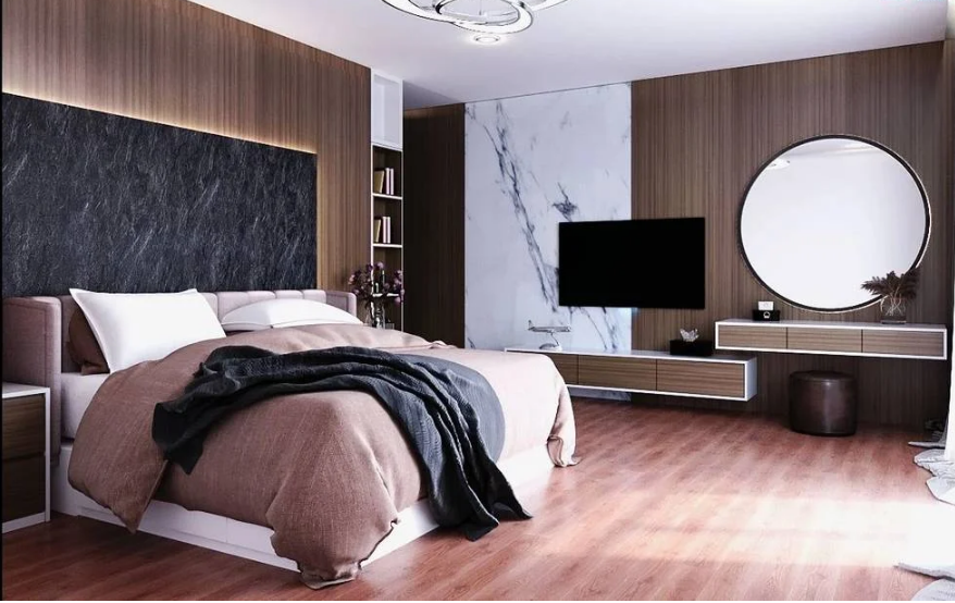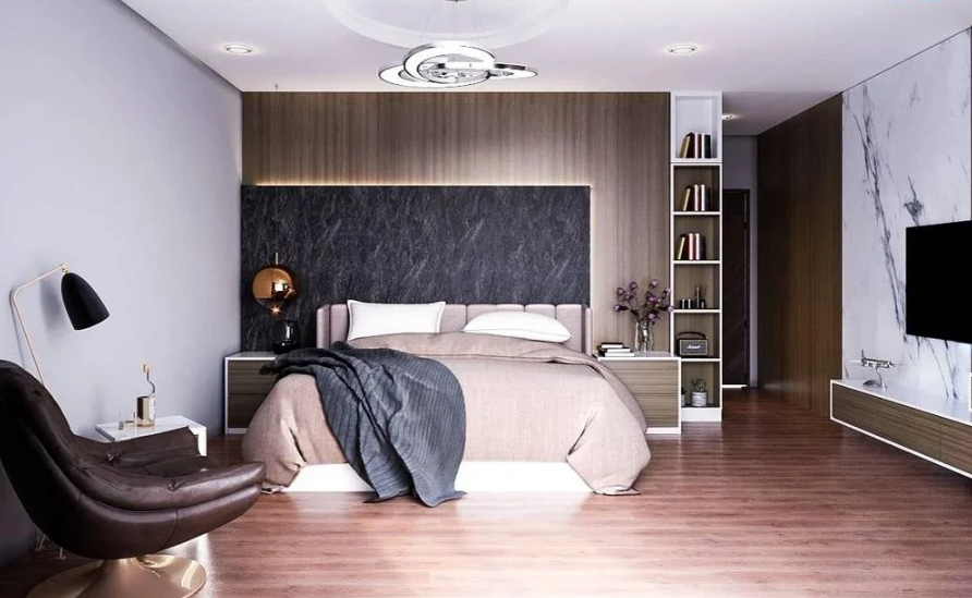 Phòng ngủ 11m2 trong thiết kế nhà phố với gam màu trắng và màu nâu gỗ là gam màu chủ đạo. Giường ngủ mang đường nét sang trọng, thể hiện sự ấm cúng và thoải mái. Kệ tivi và bàn trang điểm được thiết kế thông minh và bố trí gần nhau.