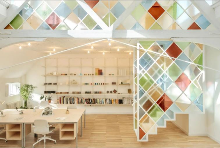 Tường kính với các hình khối màu vàng độc đáo